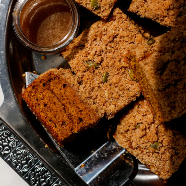 A moist and tender Pumpkin Spice Coffee Cake featuring warm spices, topped with a buttery cinnamon pumpkin seed crumb that melts in your mouth, and finished with a rich warm toffee glaze. Treat yourself to a slice of fall!