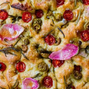 This cherry tomato, watermelon radish and rosemary no-knead focaccia bread is a simple flat baked bread that is crispy on the outside and airy and delicious in the inside. It is the perfect bread to pair with soups , make sandwiches with, or enjoy on its own.